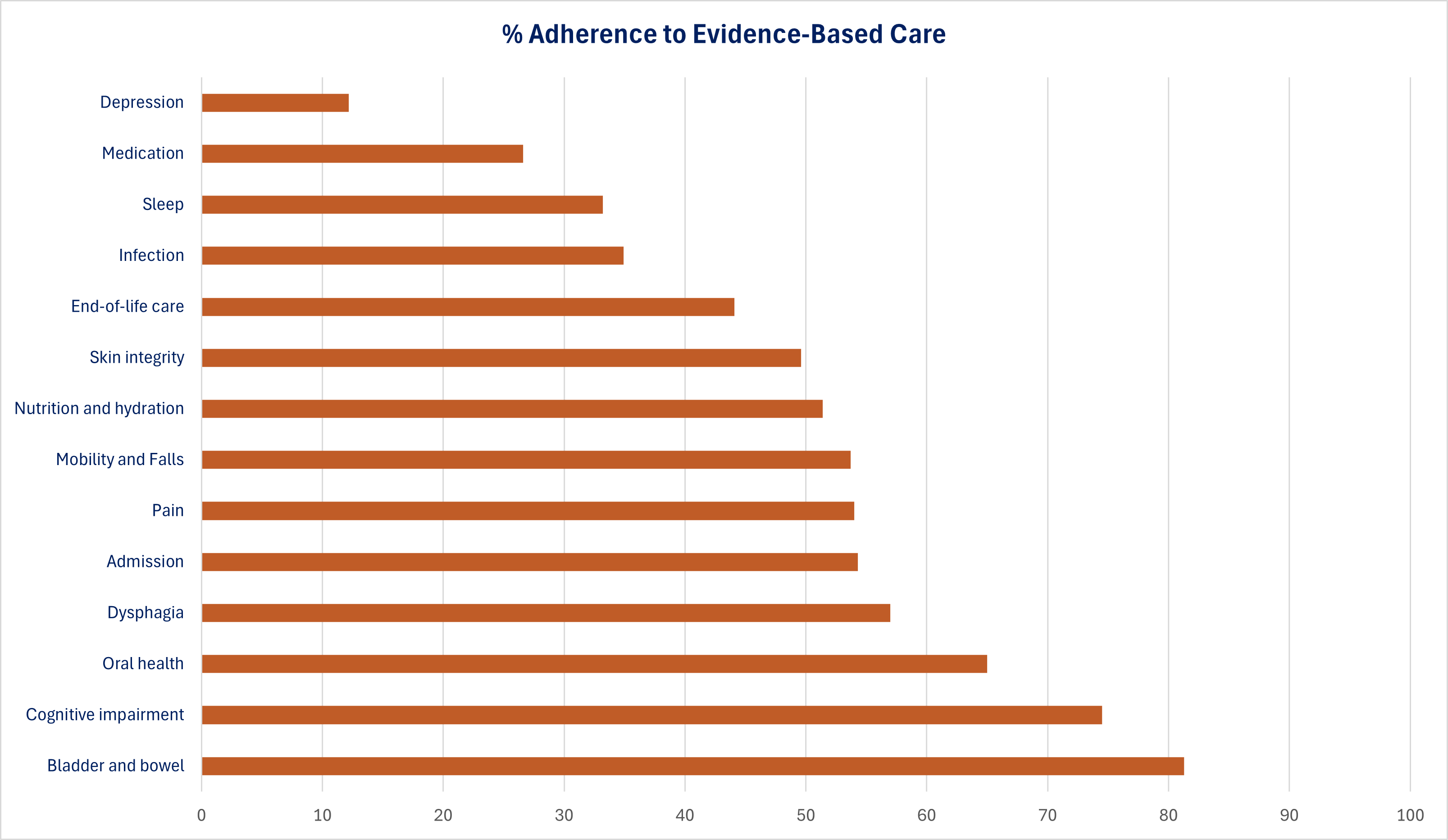 On average, the adherence rate across all indicators studied was just over half (53.2%), with a high of 81.3% for continence care, and a low of 12.2% for mental health/depression related care.